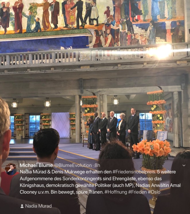 There is nothing wrong with wearing bright colours – if they fit the occasion. Which is not the case here – because she distracts from the most important person of the event, Nadia Murad.