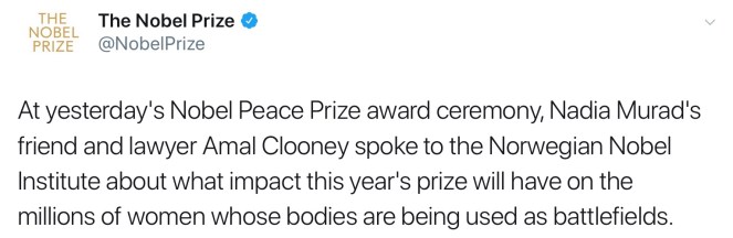 Per CNN, Muwege, who started a hospital in the Democratic Republic of Congo, “has treated thousands of rape survivors who suffered traumatic injuries at the hands of warring militias.” Meanwhile, Murad, an Iraqi Yazidi human rights activist, is a survivor of sexual violence who was previously enslaved by Islamic State militants. She’s actually worked with Clooney in trying to make ISIS accountable for genocide of the Yazidi people.
