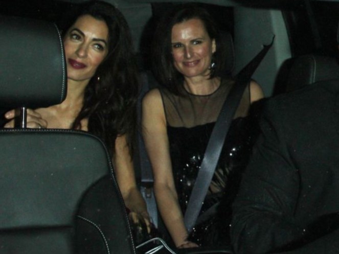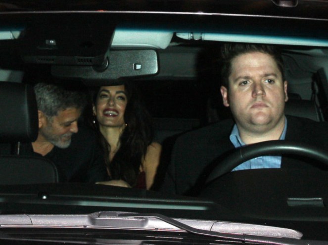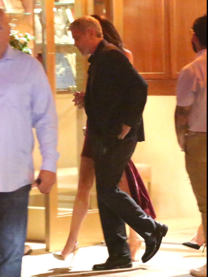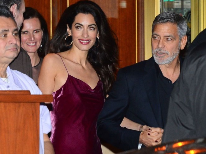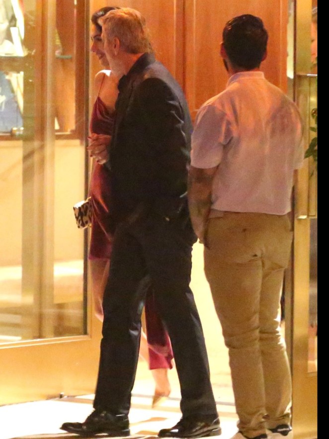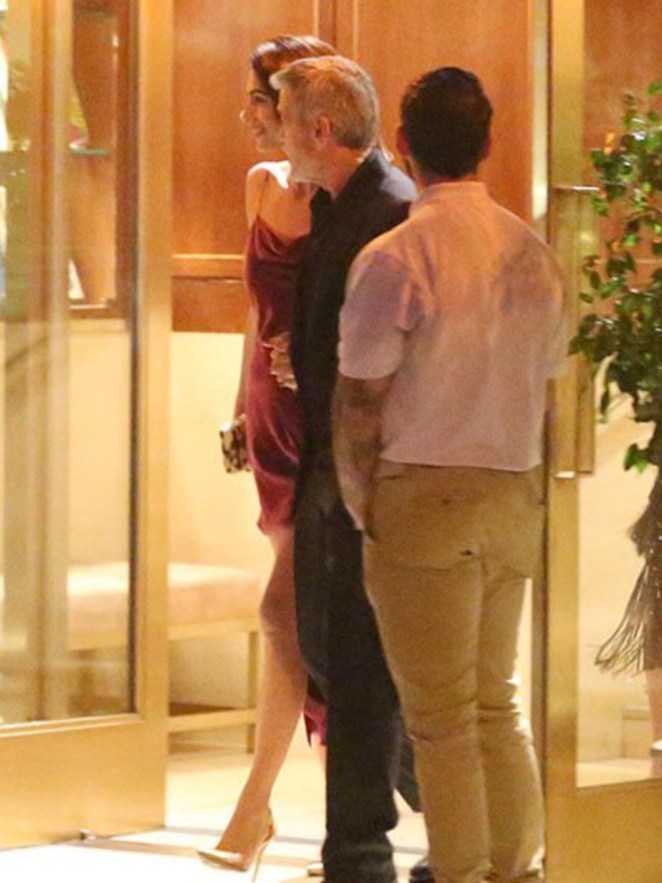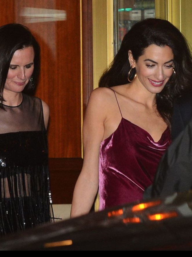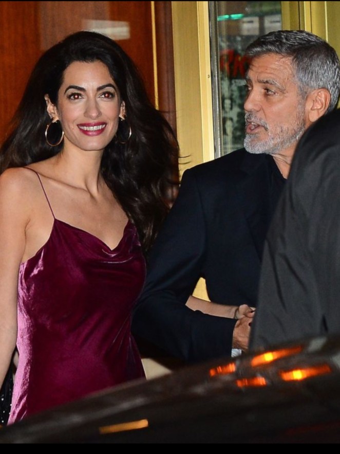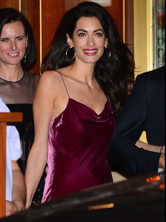 Absolutely glowing as they left Aniston’s party, George and Amal Clooney looked totally smitten with one another. Wearing a burgundy velvet minidress, with spaghetti straps, and gold hoop earrings, Amal was totally radiant. George couldn’t keep his eyes off of his wife, as per usual.