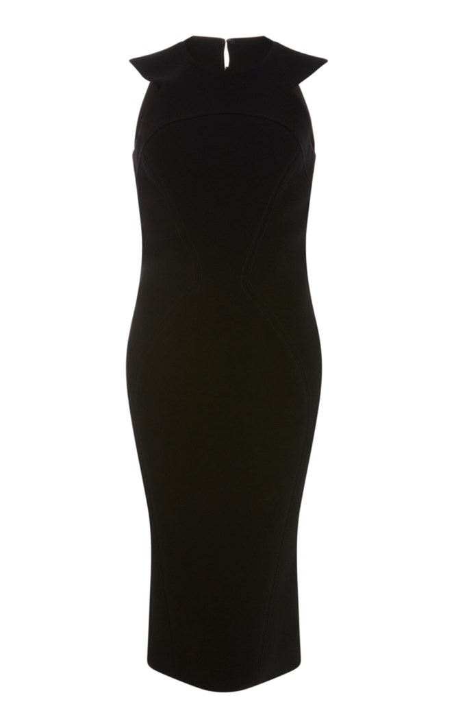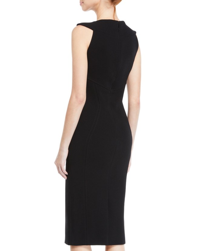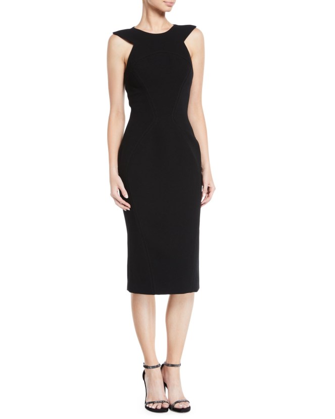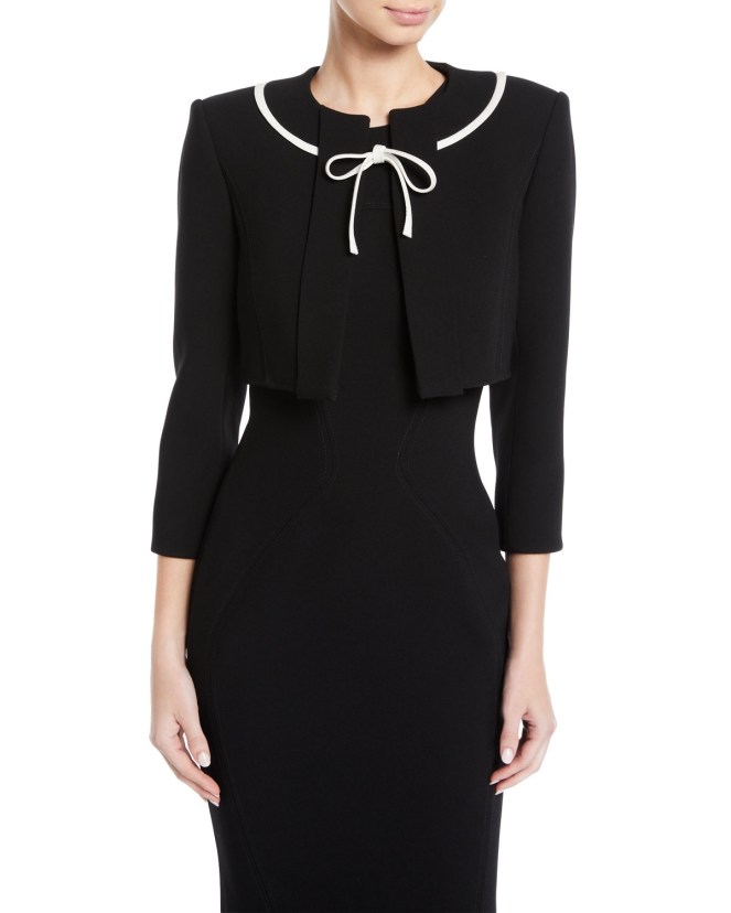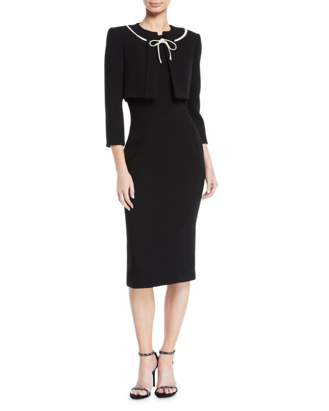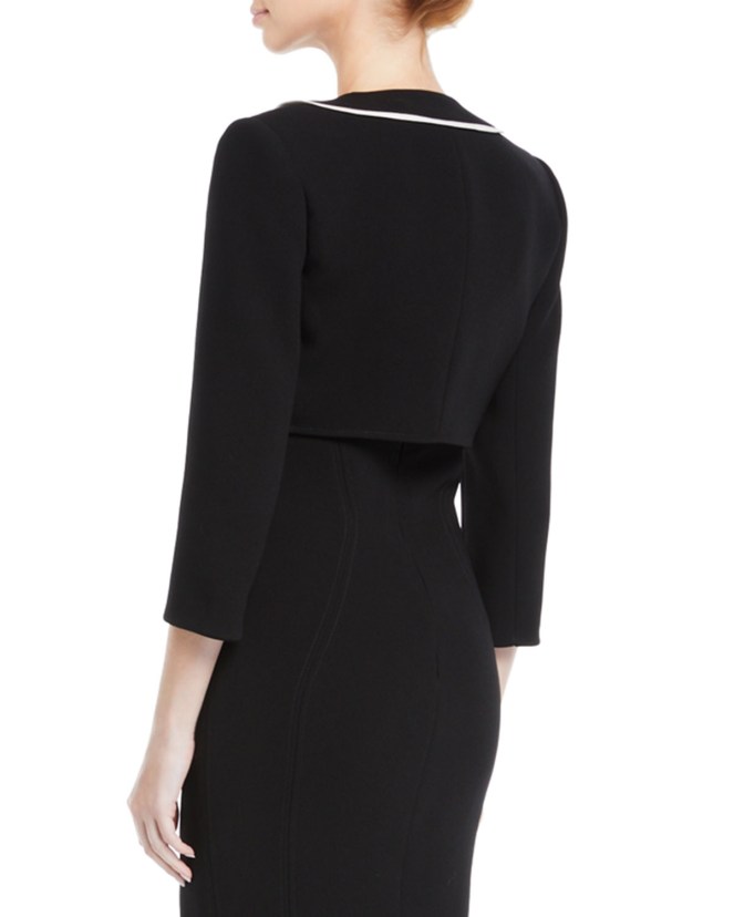 ZAC POSEN Crop Jacket with flat lapel, 3/4 length sleeves, and a white trim collar and a Zac Posen Sheath Dress with a round neckline and a fitted knee length silhouette.