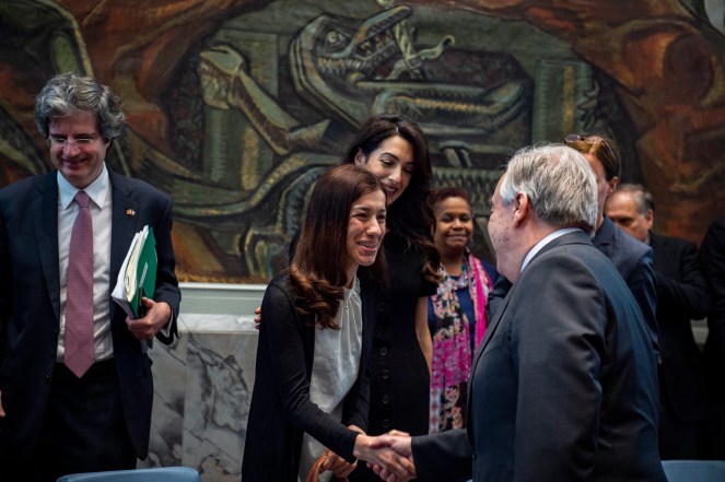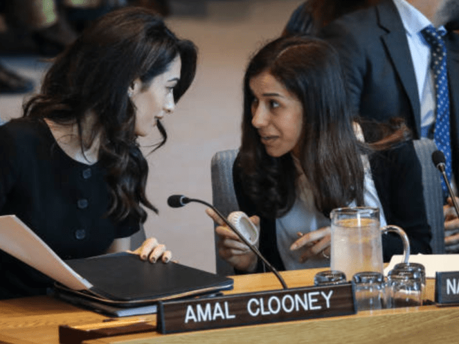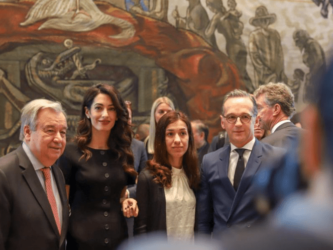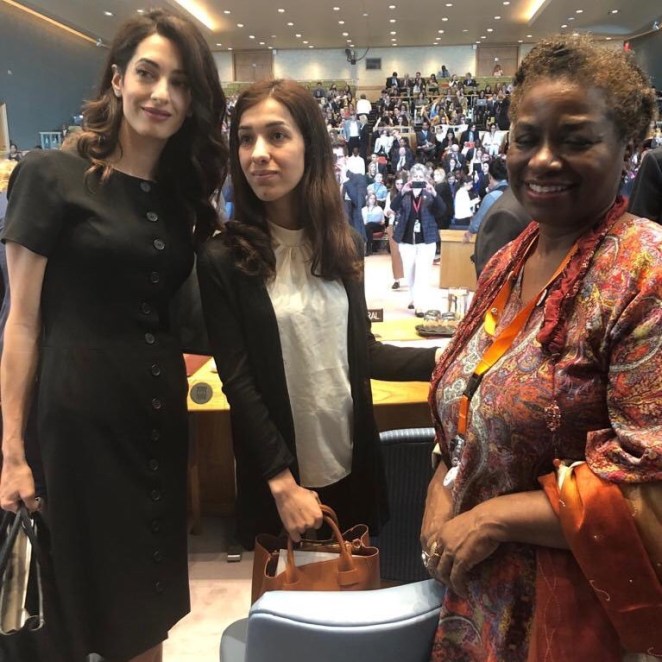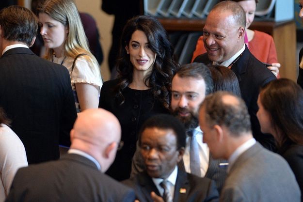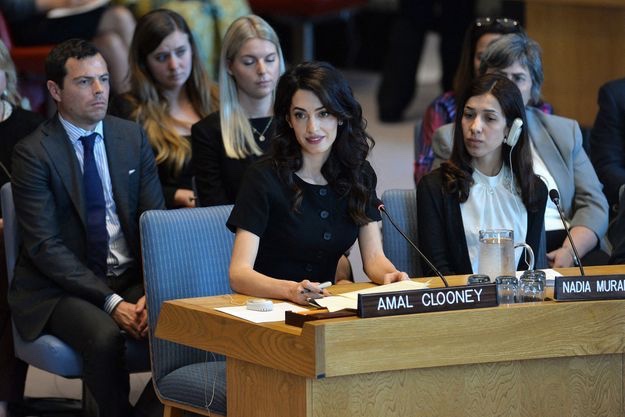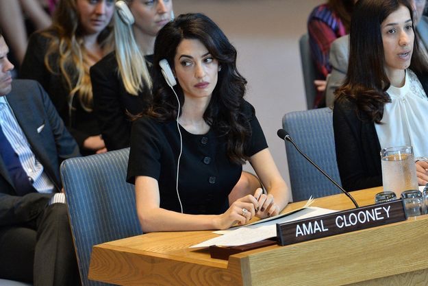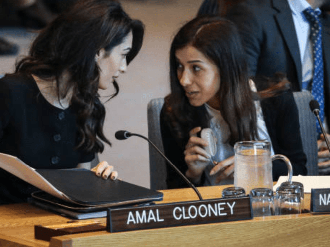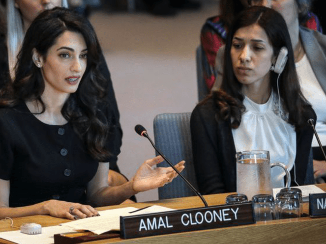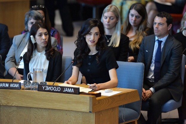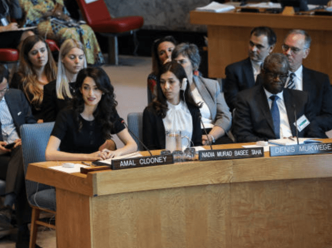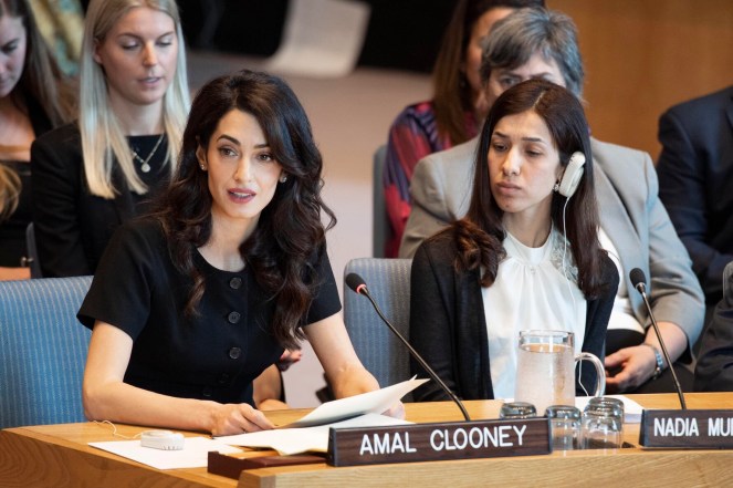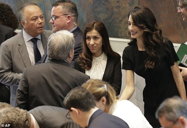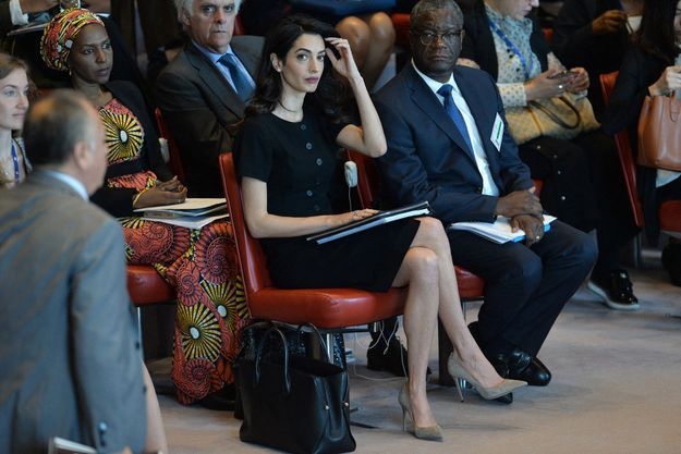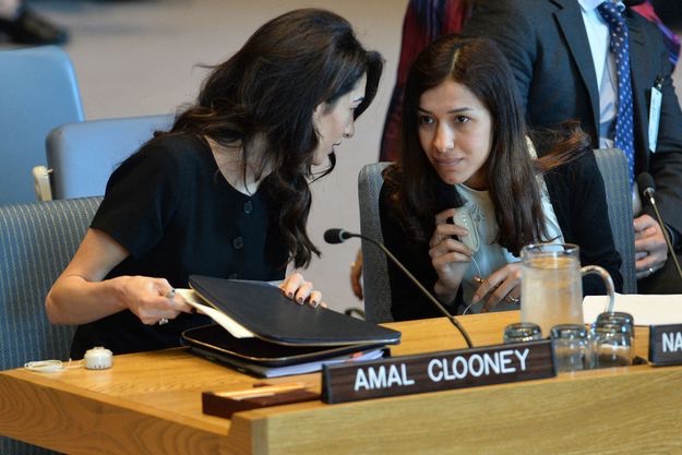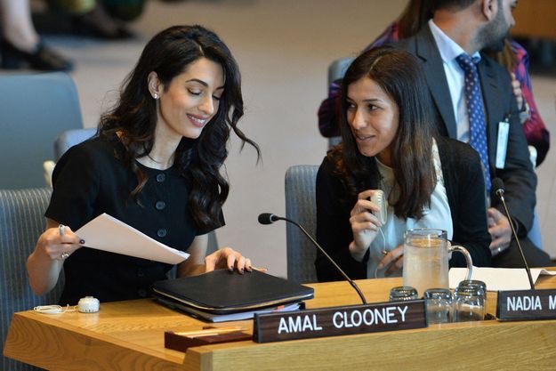Amal Clooney was joined by two 2018 Nobel Peace Prize winners, both anti-rape activists: Congolese gynaecologist Denis Mukwege and Nadia Murad, an Iraqi Yazidi who was tortured and raped by Islamic State militants.