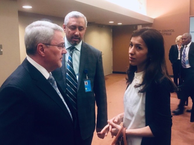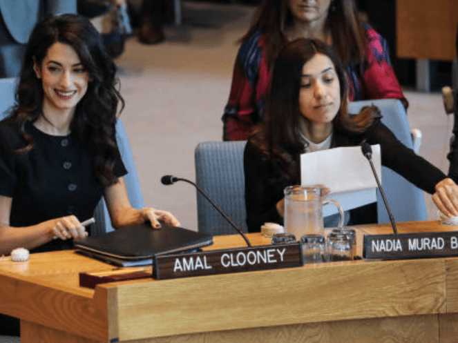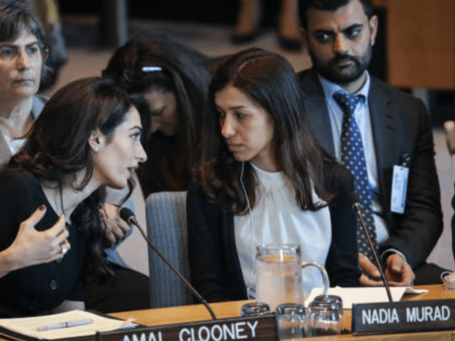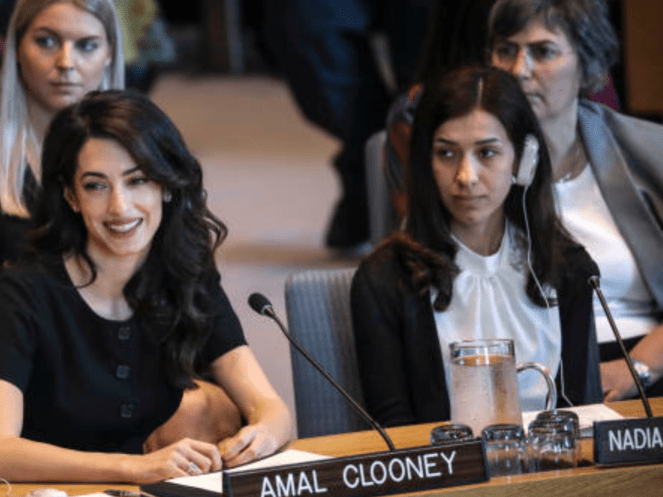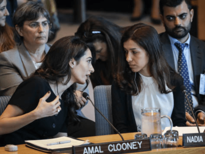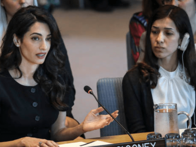 Amal Clooney told a U.N. Security Council meeting on sexual violence in conflict that the Yazidis were raped by IS men and that Mueller “was held in brutal conditions for over 18 months and raped repeatedly” by the militant group’s leader, Abu Bakr al-Baghdadi.