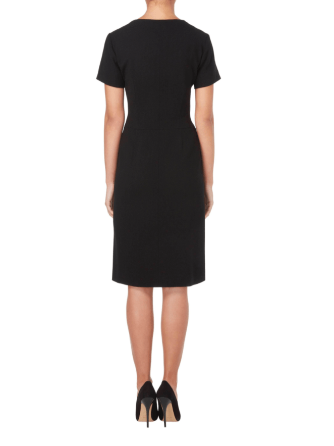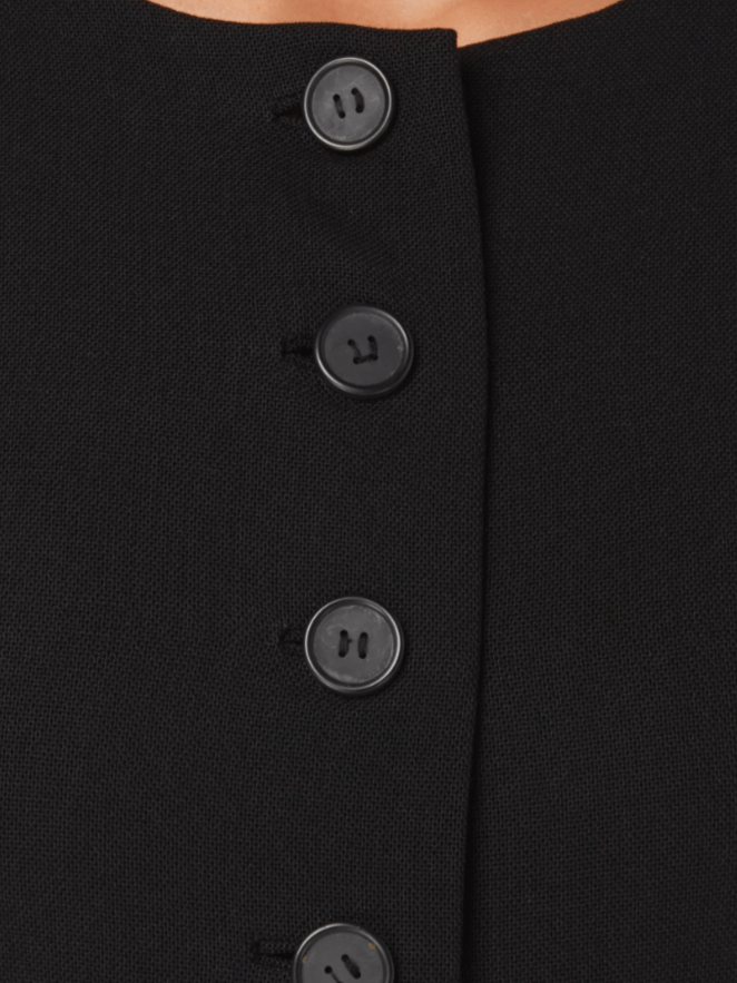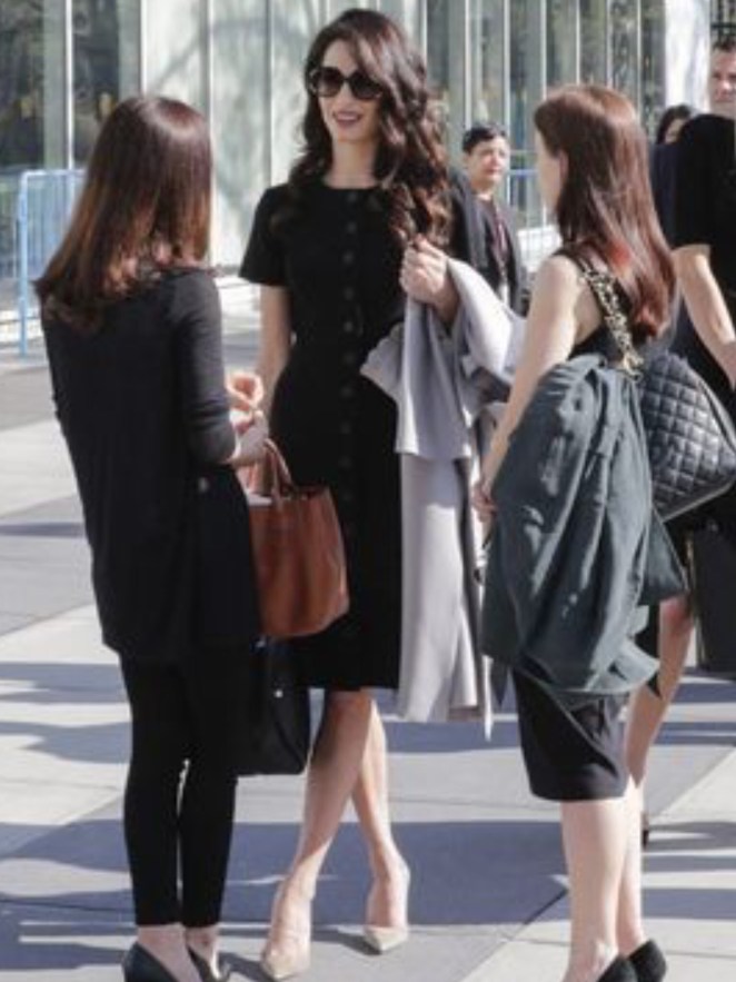 For the meeting at the U.N. Headquarters, Amal Clooney wore a smart black dress with short sleeves by Balenciaga , which featured buttons down the front. She accessorized the look with nude heels by Jimmy Choo, and wore a pair of sunglasses as she left the venue.
