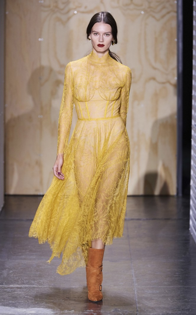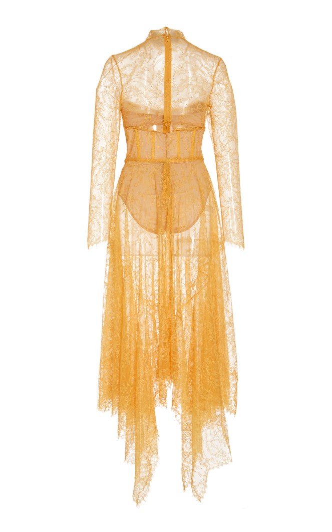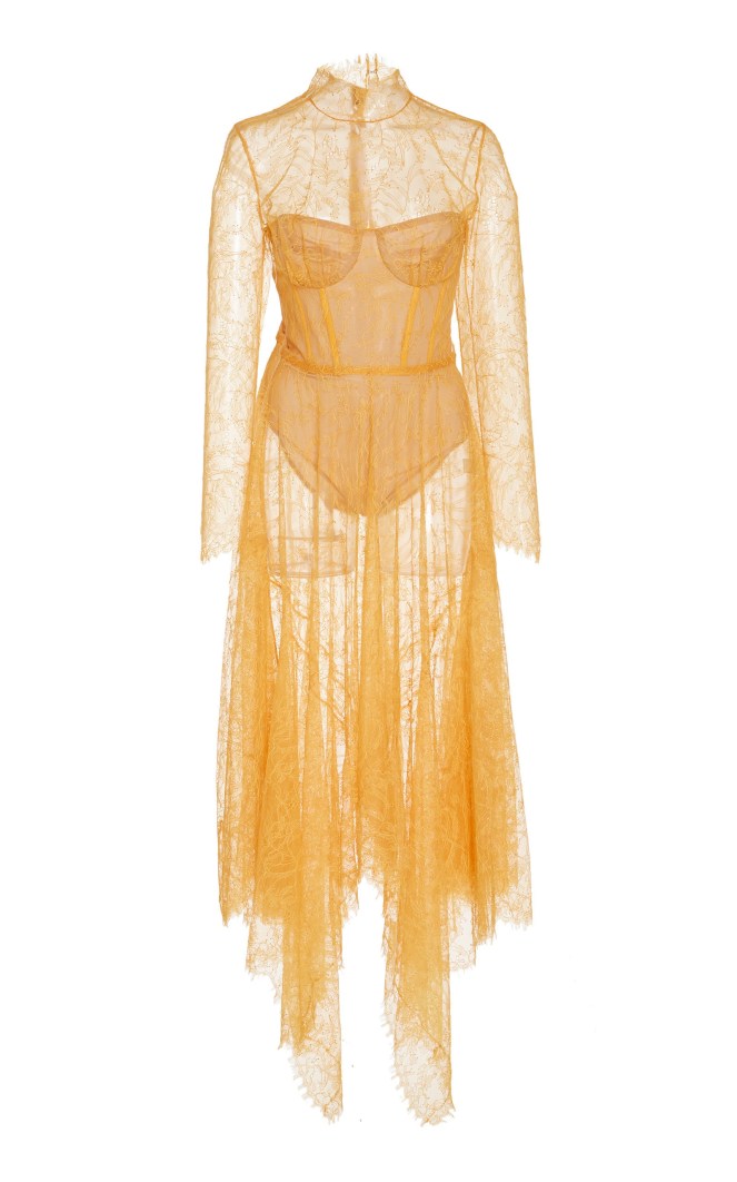 Jonathan Simkhai’s sheer lace dress is designed with a flattering high neckline, full sleeves, and a handkerchief hem. The see-through style displays a nude bustier bodysuit beneath for minimal coverage.