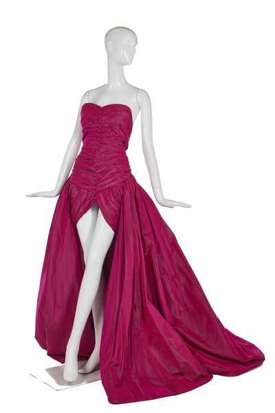 A JEAN-LOUIS SCHERRER by ERIK MORTENSEN fuchsia changeant taffeta evening gown, Autumn-Winter 1995-96, unlabelled, handwritten archive label attached, long-line bodice, the voluminous trained skirt falling to the rear exposing the legs when worn; together with two other examples in taffeta, 1990s, handwritten défilé labels and archive tags, busts approx 86cm, 34in (3) Provenance: the final chapter of the Jean-Louis Scherrer Archive