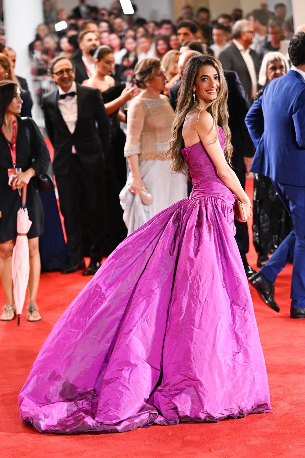 Amal Clooney lit up the red carpet in a corset-style fuchsia minidress fitted with a billowing train that took over the entire carpet.