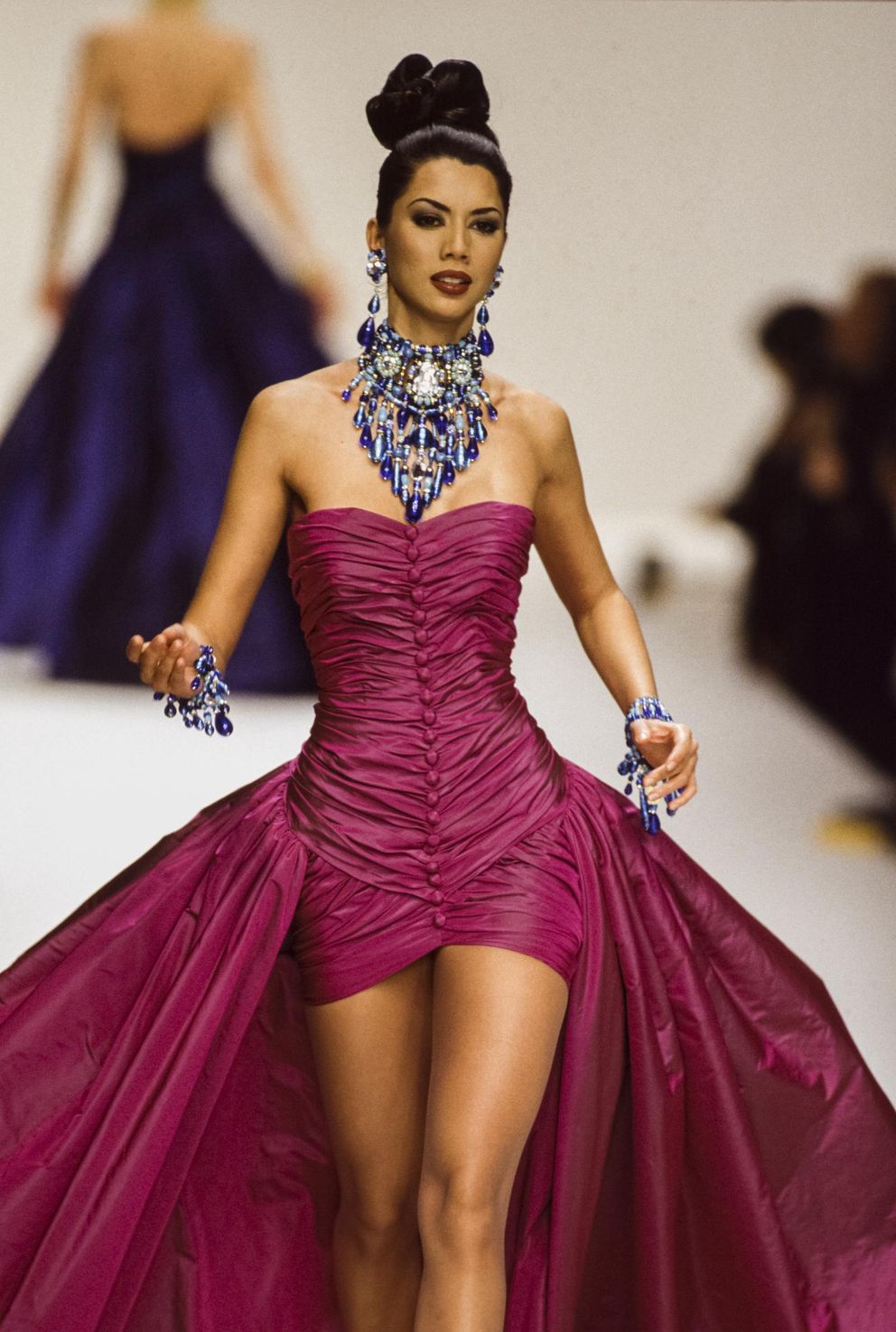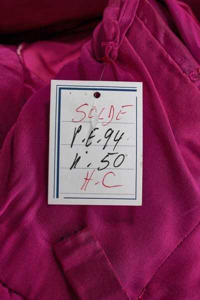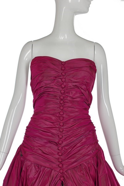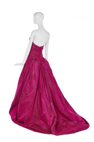 A JEAN-LOUIS SCHERRER by ERIK MORTENSEN fuchsia changeant taffeta evening gown, Autumn-Winter 1995-96, unlabelled, handwritten archive label attached, long-line bodice, the voluminous trained skirt falling to the rear exposing the legs when worn; together with two other examples in taffeta, 1990s, handwritten défilé labels and archive tags, busts approx 86cm, 34in (3) Provenance: the final chapter of the Jean-Louis Scherrer Archive